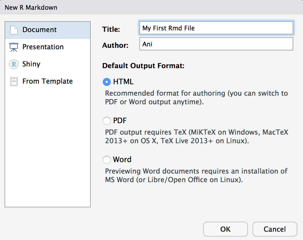 mpa5830.Rproj and everything should work seamlessly unless something breaks New File -> R Markdown ... and enter a My First Rmd File in title and your name.