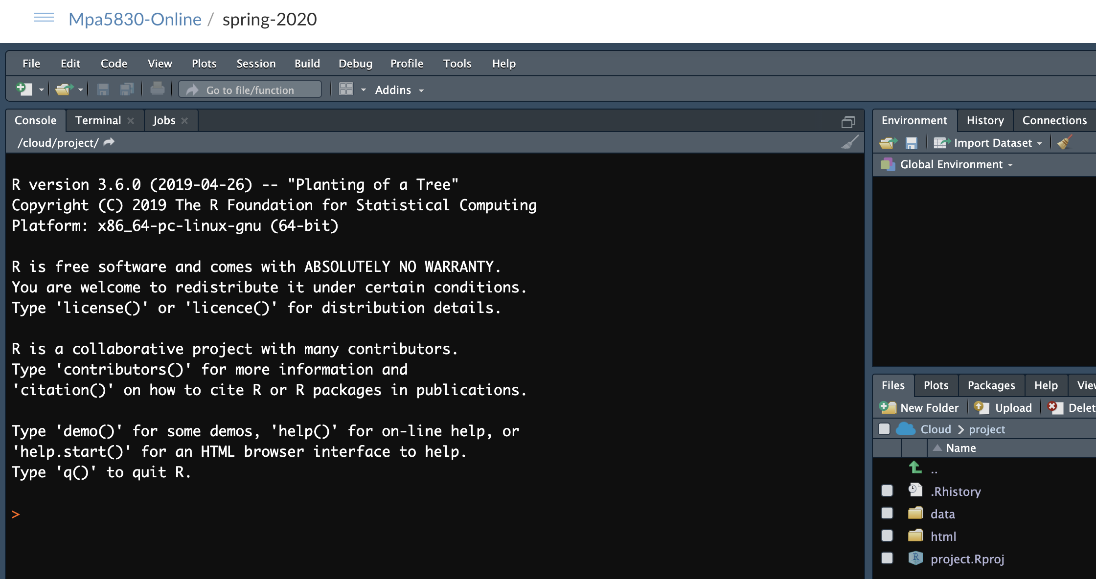 RStudio will restart and you will be in the project folder, seeing a file called mpa5830.Rproj